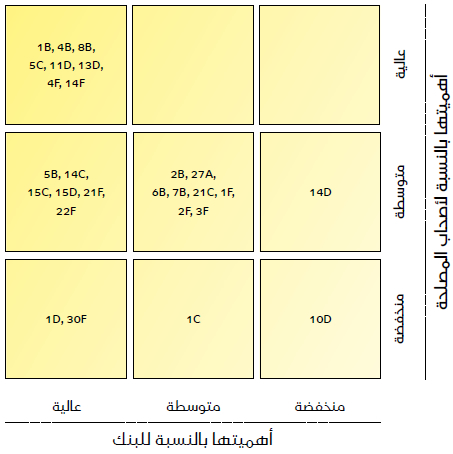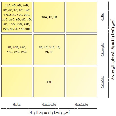 وكانت الخطوة التالية هي وضع مخطط للمسائل التي لها التأثير الأكبر على أصحاب المصلحة والبنك السعودي للاستثمار أو أيٍ منهما. وصُنِفت المسائل على أنها مسائل تنطوي على مخاطر، أو مسائل تحمل فرصاً، أو كليهما.